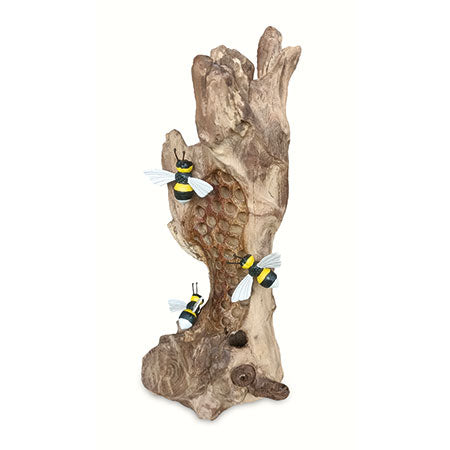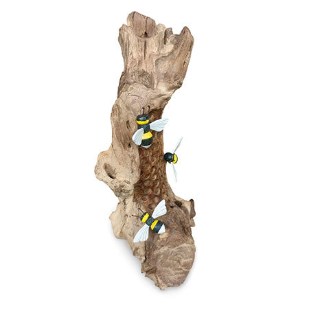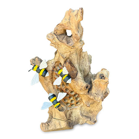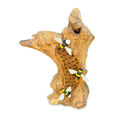 MB494This unique sculpture of a natural beehive in a teak root ‘tree trunk’ has 3 cute hand-carved, hand-painted black and yellow bumblebees buzzing around it - a fabulous gift for any bee or nature lover.