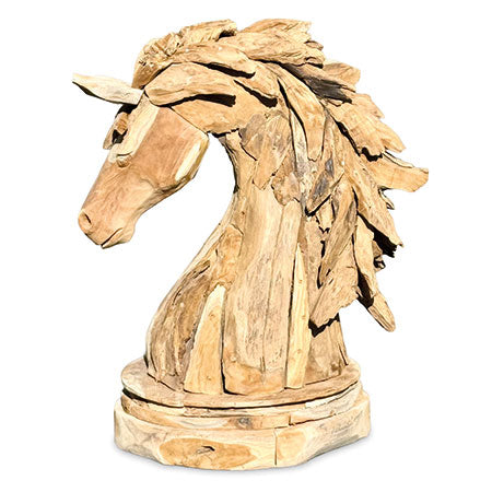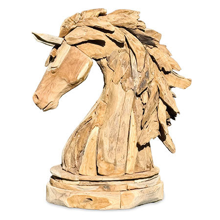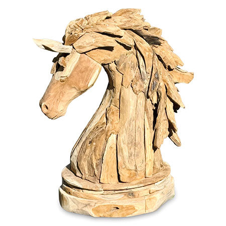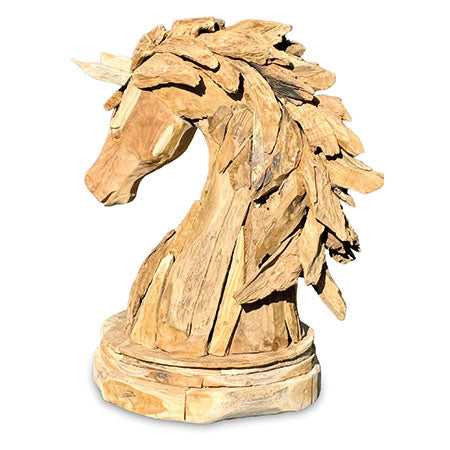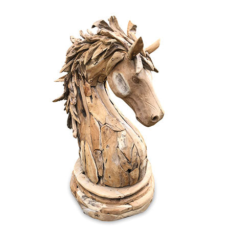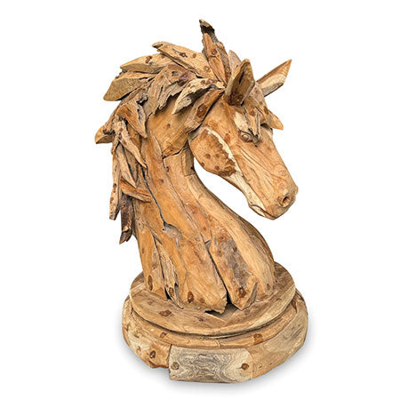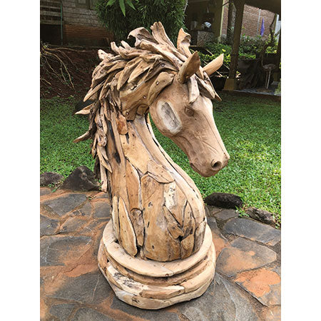 MJ752Marvellously unusual horse’s head sculpture, hand-sculpted from teak root to resemble a huge knight chess piece. Each one of these fabulous sculptures has their own unique style and character.