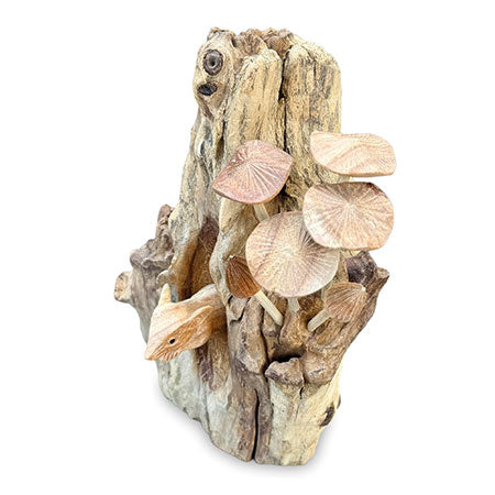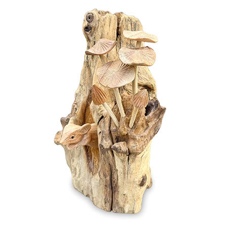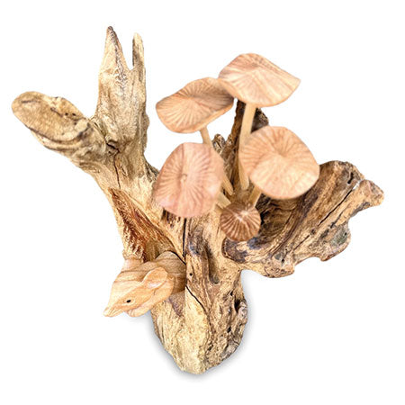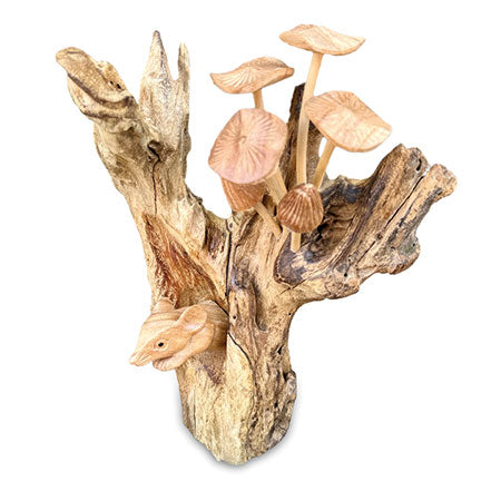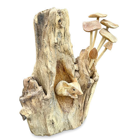 MB468Shy little mouse, hiding under a cluster of mushrooms growing from a teak root base. Hand-carved from sustainable albasia wood.