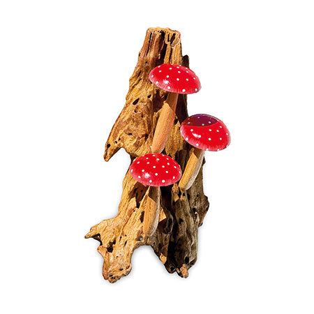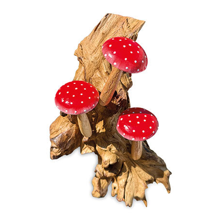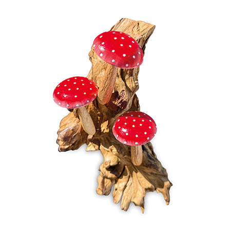 MB430Our painted mushroom sculptures present a range of hand-carved and hand-painted mushrooms inspired by the natural world. This sculpture features three fabulous red and white-spotted mushrooms growing from a root base which hangs from the wall. Also available with three violet mushrooms.