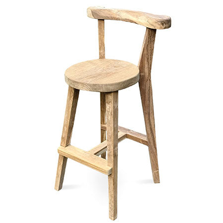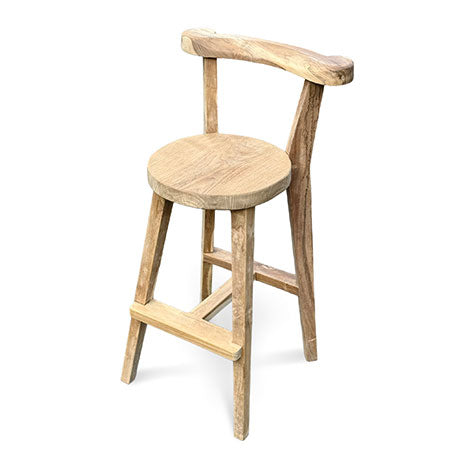 MJ762Hand-carved teak bar stool in a classically rustic design, with a stylish back rest for a more comfortable perch. Suitable for indoor or outdoor use.