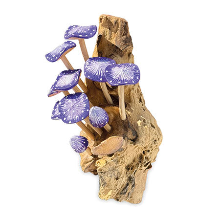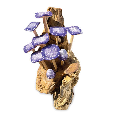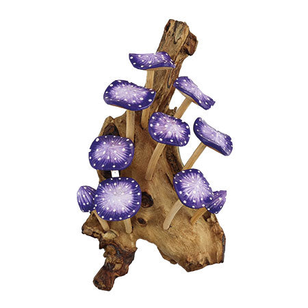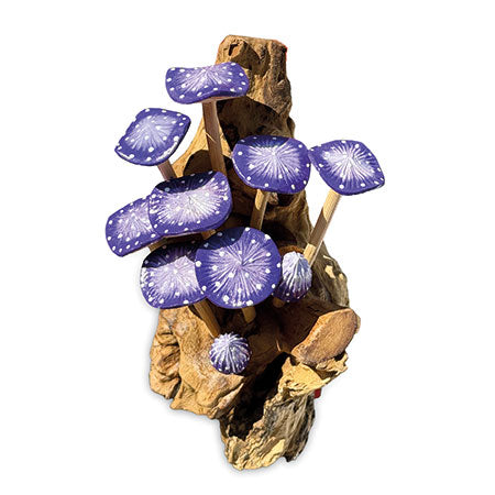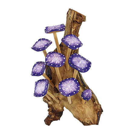 MB429Our painted mushroom sculptures present a range of hand-carved and hand-painted mushrooms inspired by the natural world. This sculpture features 10 vibrant indigo mushrooms growing from a root base, ready to hang on the wall.