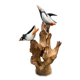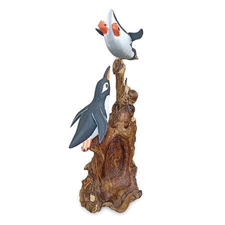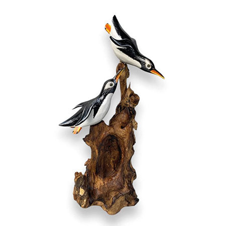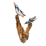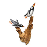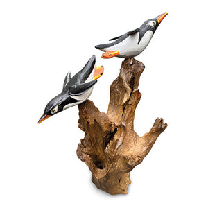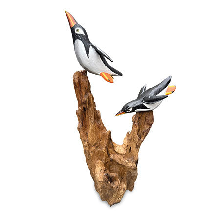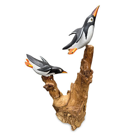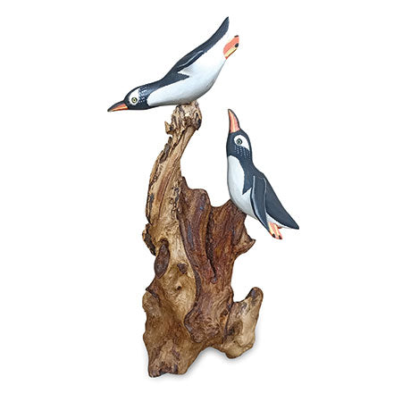 MB433Our cute little cliff diving penguins are hand-carved and hand-painted, perched on a teak root cliff waiting to take the plunge. Available with single or double penguins.