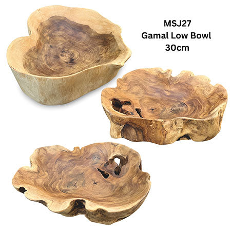 MSJ27Our Gamal bowls are delightfully rustic, made from sustainable Balinese gamal wood with a hand-carved concave centre – fabulously unique and about as far from mass-production as you can get! 30cm wide - different sizes and shapes available.