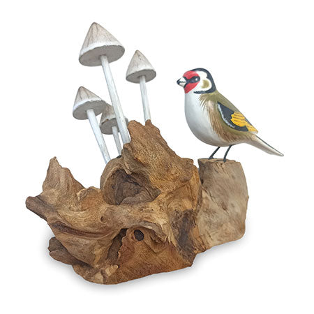 MB386Our sweet little goldfinch is perched on a driftwood-style teak root base with a group of mushrooms growing nearby. Hand-carved and hand-painted by Indonesian artists.