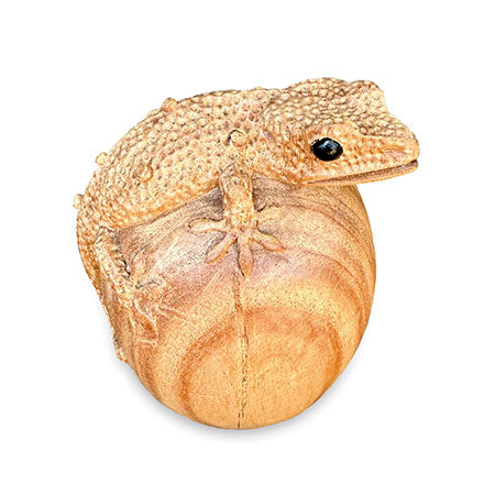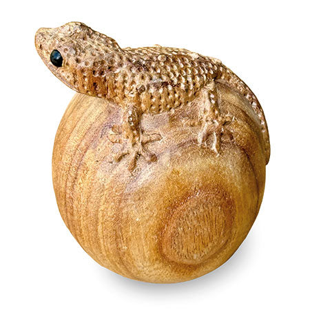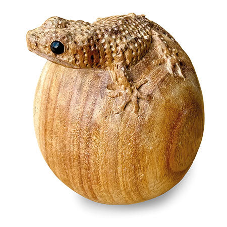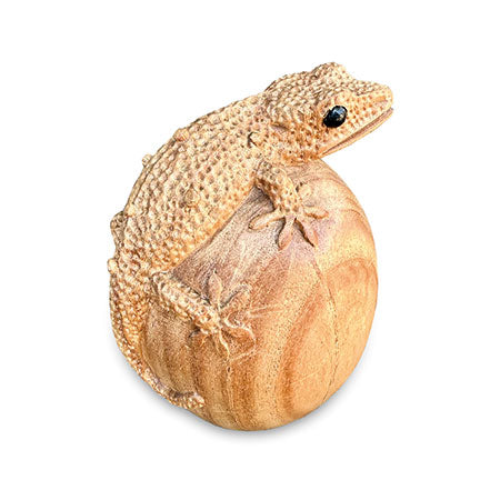 MB453Gorgeous little gecko, hand-carved from sustainable suar wood, perched on top of a hand-carved egg. Also available in 10cm.