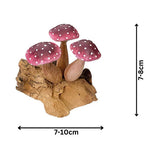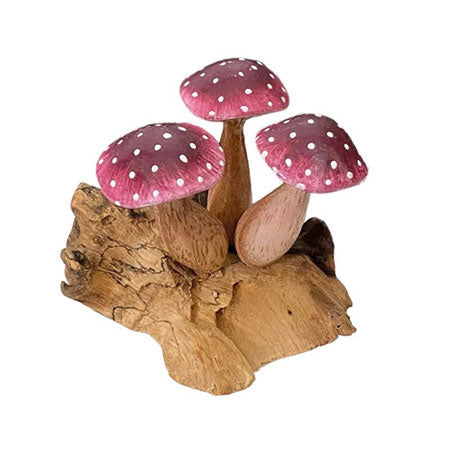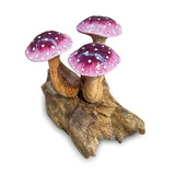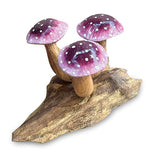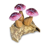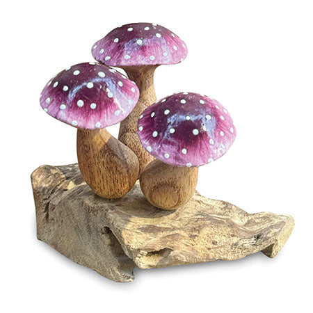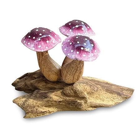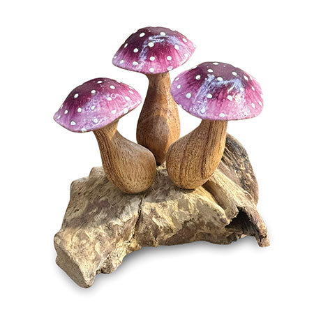 MB376Our painted mushroom sculptures present a range of hand-carved and hand-painted mushrooms inspired by the natural world. This sculpture features three gorgeous lilac bonnet, white-spotted mushrooms growing from a root base.