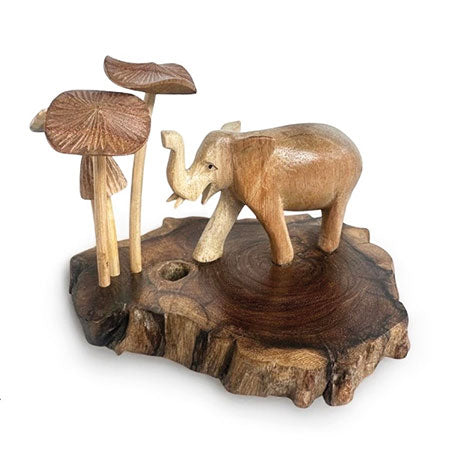 MB485Trumpety-trump it’s Nellie the elephant, stomping along in a forest of mushrooms growing from a teak root slice. Hand-carved from sustainable albasia wood.