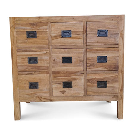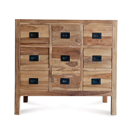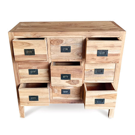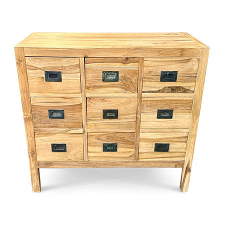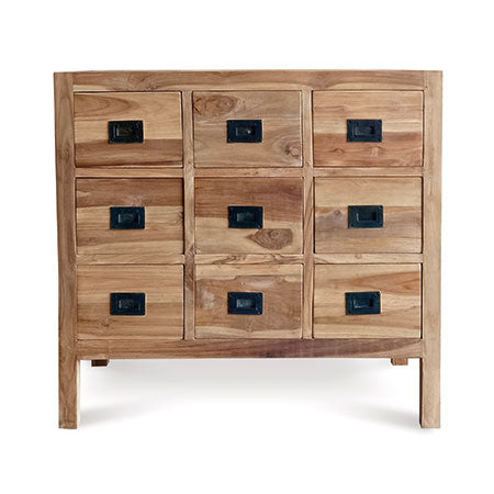 MSJ36Made by repurposing upcycled and reclaimed wood from discarded teak boats and furniture, our modern-style, hand-carved cabinet is supported by 4 legs and has 9 identical drawers with inset black metal handles on each.
