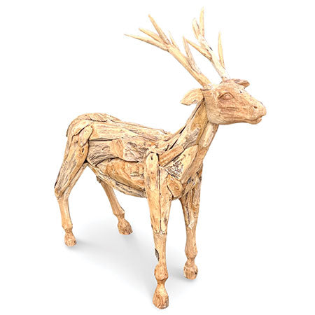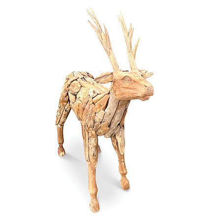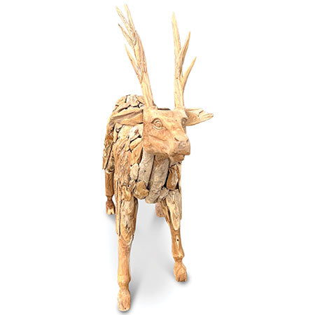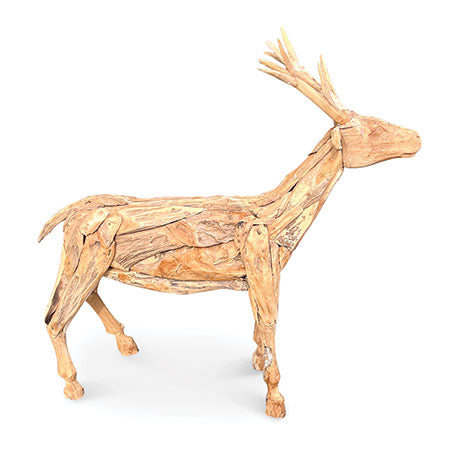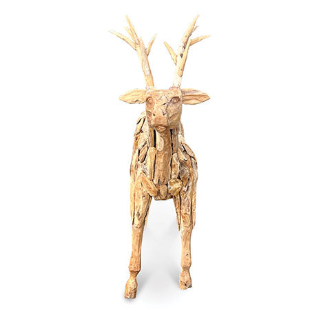 MJ286Hand-carved and sculpted from teak roots by artists in Indonesia and standing 120cm tall, this junior stag would look great in the house or garden at any time of year and will be a great favourite with the family in December! Also available in H 175cm.