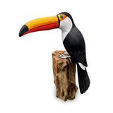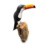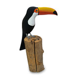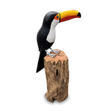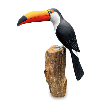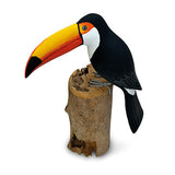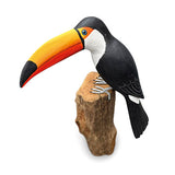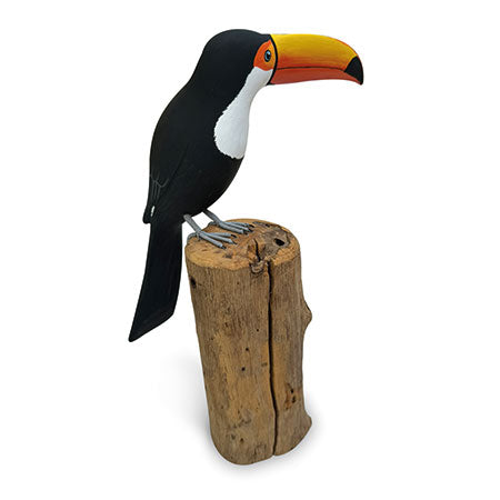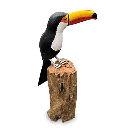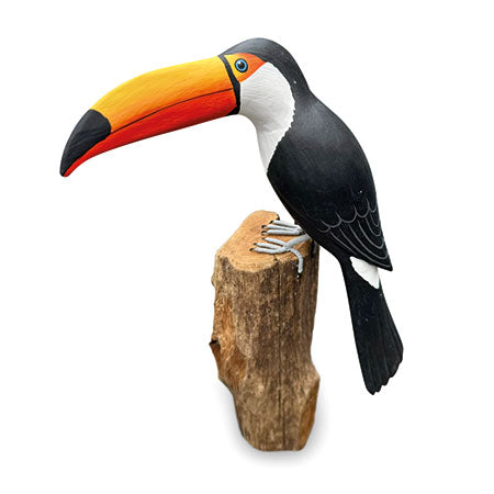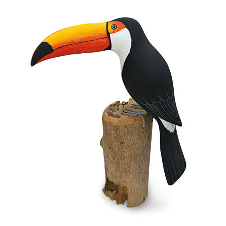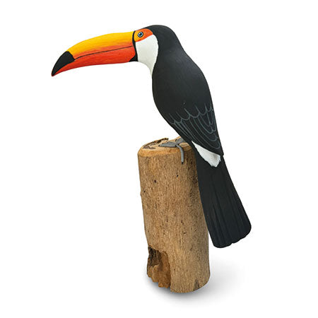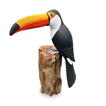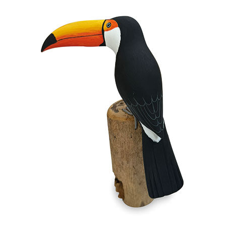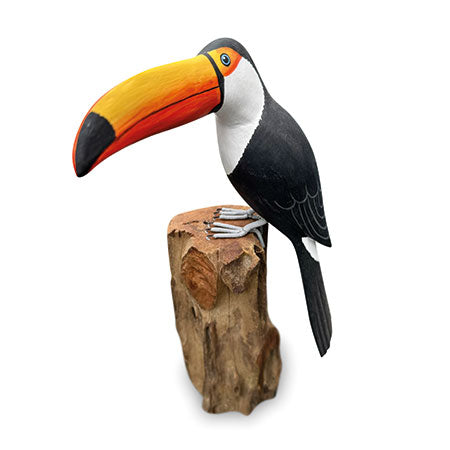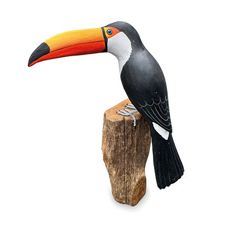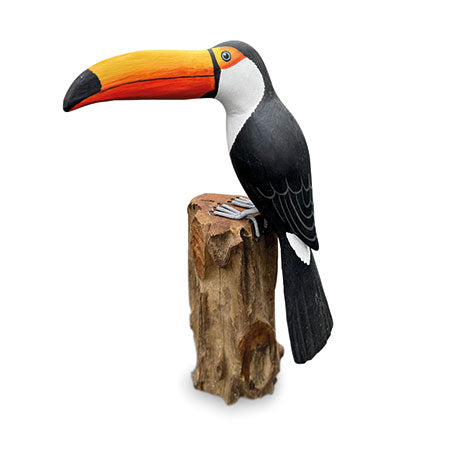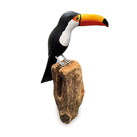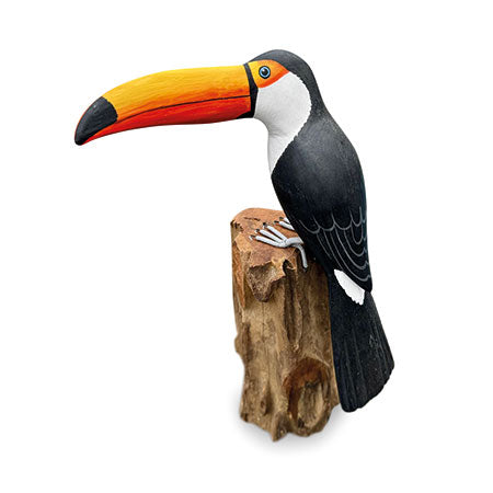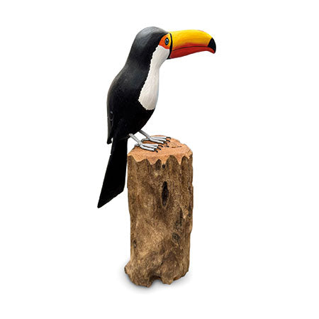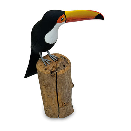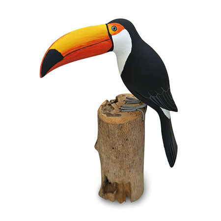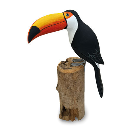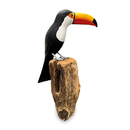 MB358Toucans are found in the rainforests of Central and South America. They’re vital to keeping the rainforests alive, eating the native fruits and passing the seeds, maintaining the forest’s diversity. Our toucan, perched on top of a tree trunk, is hand-carved and beautifully hand-painted.